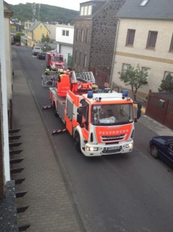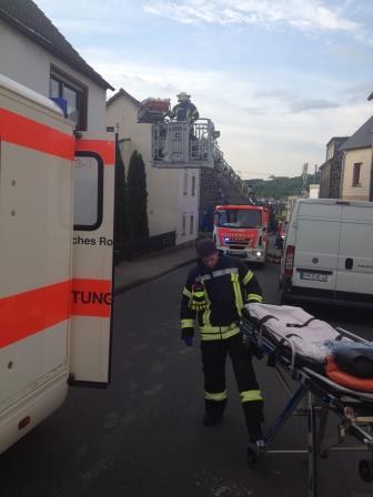 Am frühen Sonntag morgen musste eine 74jährige Frau mit der Drehleiter vom 1. OG in den Rettungswagen verbracht werden.