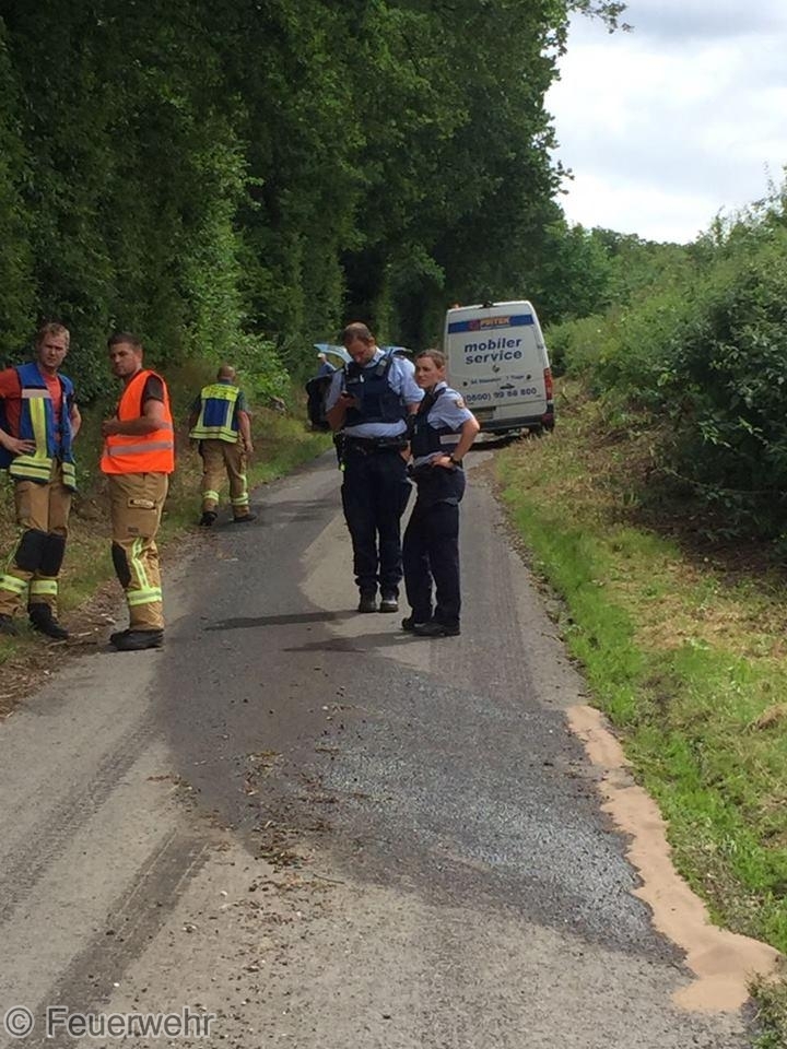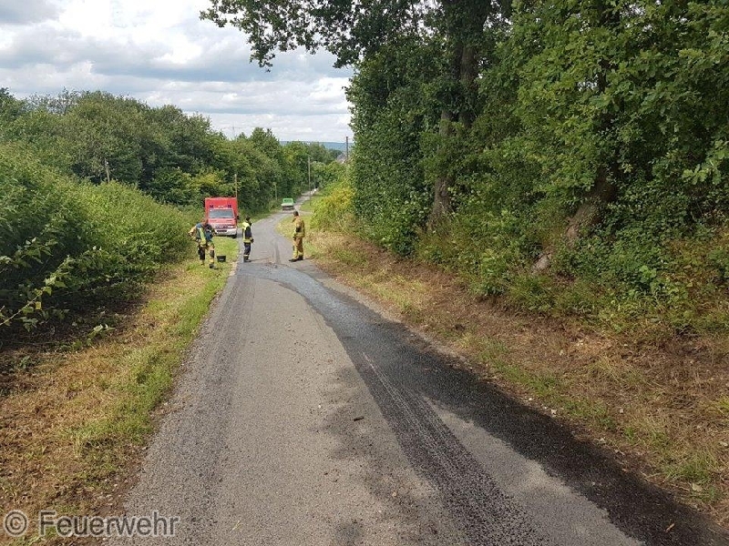 Zügig wurde ausgerückt und vor Ort zeigte sich, auslaufendes Hydrauliköl aus einem landwirtschaftlichen Gefährt, welches den Einsatzkräften "auf der Holl" entgegen geflossen kam.