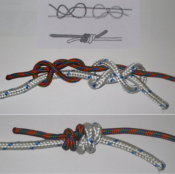 Verbindung von zwei ungleich starken Leinen (einfach oder doppelt geknotet, mit oder ohne Aufzugschlaufe)