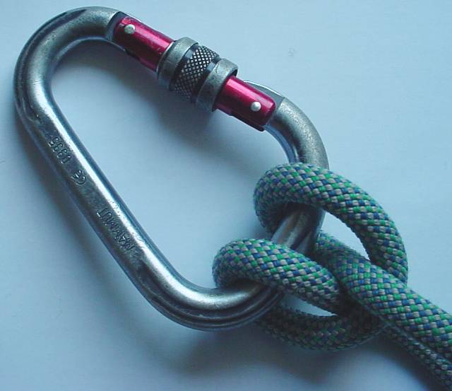 Verhindern des Seilauslaufes aus einer Öse oder eines Beschlages und zum Sichern im Gurtzeug des Absturzsicherungs- oder Höhenrettungssets, Verbindung zweier gleich starker Leinen