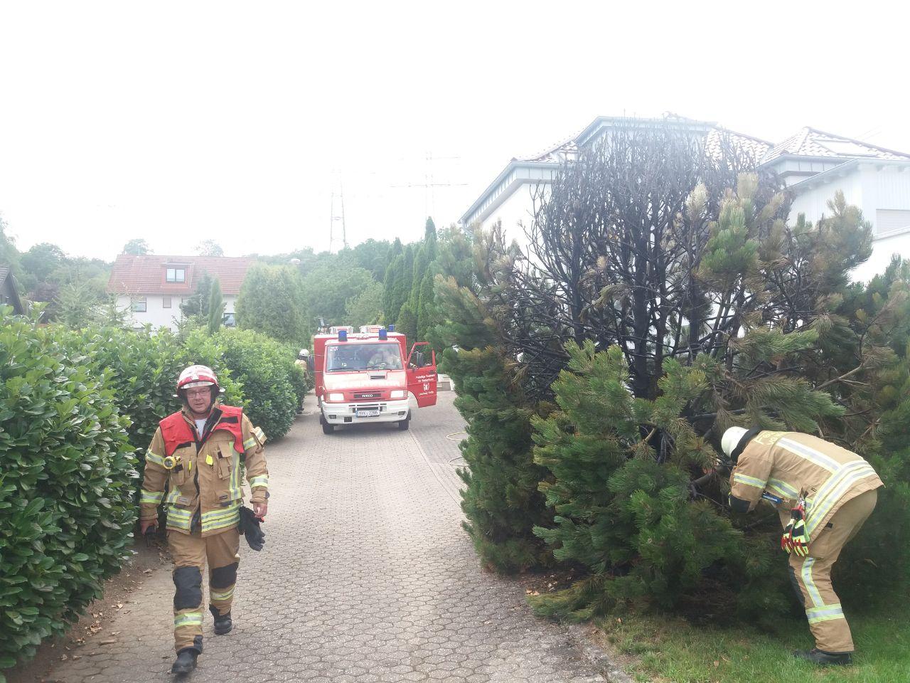 Vor Ort zeigte sich, dass die Anwohner bereits tatkräftig den brennenden Baum in Hausnähe mit dem Gartenschlauch gelöscht hatten.