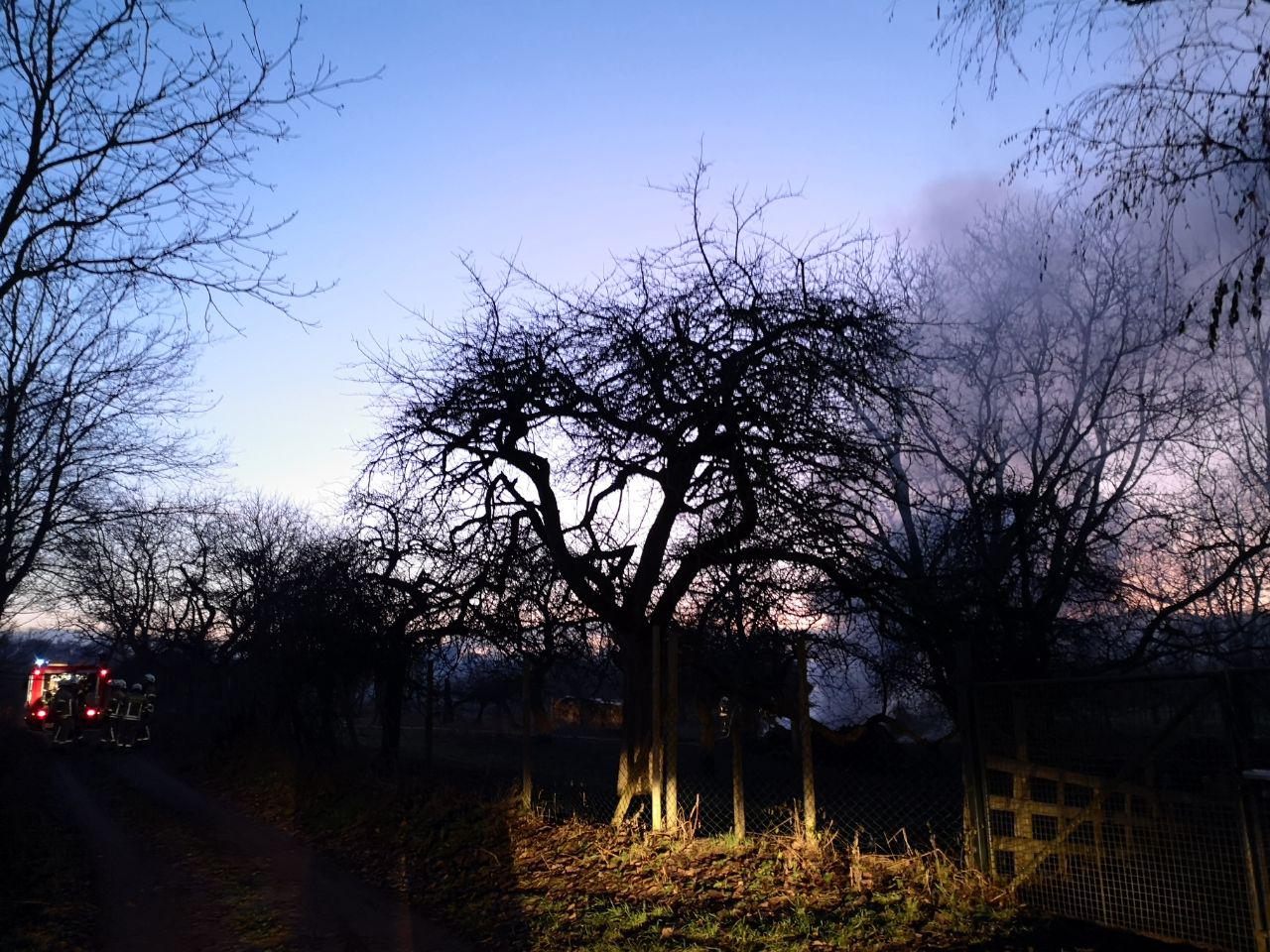 An der Einsatzstelle zeigte sich in der Tat ein brennender Stapel mit gemischtem Inhalt. Ein Besitzer/Eigentümer war nicht vor Ort, so dass der Brand gelöscht werden musste.